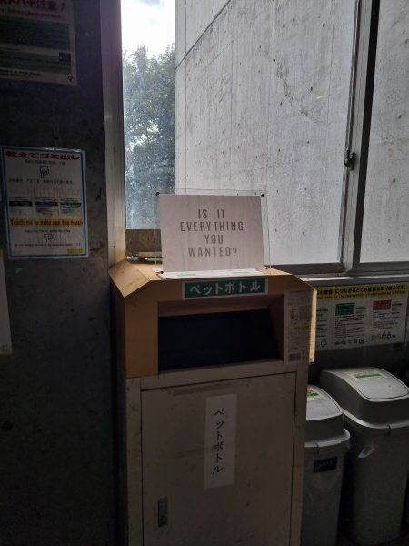 日本に来てから生まれた問い ” Is it everything you wanted?(それがあなたが望むすべてですか?)” を半透明の紙に印刷して透明なフレームに挟み、藝大キャンパスの建物内の色々な場所に置きました。もともとは個人的な実験として始めたんです。この作品は実際には複数のレイヤーで構成されています。テキストの各行は重なった紙によって徐々に覆われていき、下の行にいくほど半透明性が低くなり、読み取りにくくなっています。そのため「Is it」 の部分が最もはっきりと見え、「wanted?」 に近づくにつれて不明瞭になります。これは、何かを強く望んで手を伸ばすほど、その対象がかえって遠ざかっていくように感じられる感覚を表現しています。