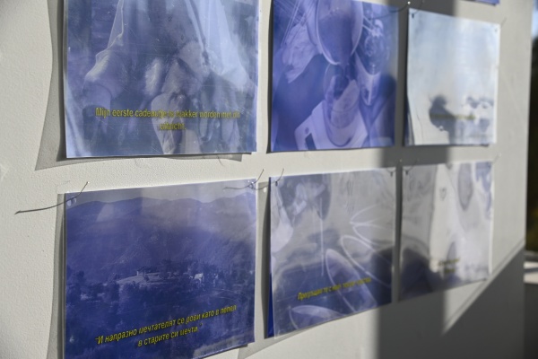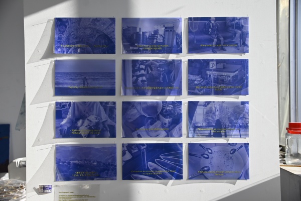 最後は、写真の上に、ブルガリア語やオランダ語で書いた短文を印刷した透明のシートを重ねてください。私にはわかるけれど周さんや加藤さんにはわからないという状態です。私は日本語がわからないので、お二人には私が日本語と写真の組み合わせを見ている時に感じていることと同じことを体感していただくことになります。