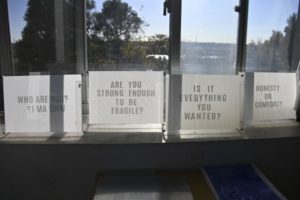 そして、GAPのある建物の照明がとても素敵だと気づき、そこからインスピレーションを得て、問いを挟んだフレームを、毎週違う場所に移動させました。見る場所や見る時間によって問いの持つ意味が変わったり、暗くなると文字はほとんど見えなくなるので、読めなかったりもします。