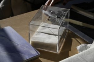 私は問いを投げかけるけど、見た人は頭の中で答えるだけで、私には決してわからないものだと思っていました。それが、答えが返ってきたんです。これがすごく楽しかったので、この経験をもとに、昨年の取手藝祭(取手キャンパスで行われる学祭)では他の問いも制作してキャンパス内にあちこち配置しました。また、自分の考えや感情について匿名で回答を書けるスペースを設けました。投稿する箱はプラスチックの透明な箱で、封筒は半透明なので中身が透けて見えたりもします。たくさんの人が投函してくれました。