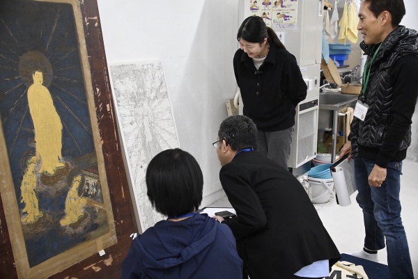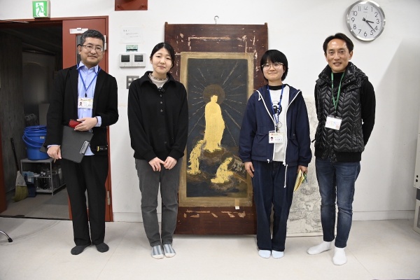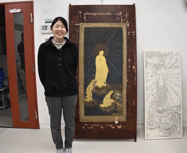 上野公園の木々が色づく11月中旬、東京藝術大学(以下、藝大)構内の赤レンガ2号館へ文化財保存学専攻 保存修復日本画研究室 修士2年の堀内七海さんを訪ねました。笑顔で玄関まで出迎えてくれた堀内さんと共に階段を上り、靴を脱いで、堀内さんが制作に使う作業場に入りました。そこで私たちを待っていたのは、金色の阿弥陀さまの絵と、白黒の同じ阿弥陀さまの絵でした。