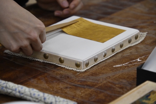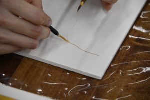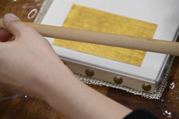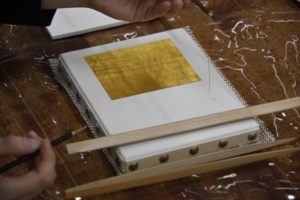 筆先の細い筆を2本使って貼り付けます。一方の筆に水分を含ませ穂先に金箔を取り、もう片方の筆で糊となる「膠(にかわ、動物の皮や骨に含まれるコラーゲンを抽出して作られる天然の接着剤)」と「ふのり(膠が固まりづらくなる海藻から出来た接着剤)」を調合した液体を画布に引き、その上に箔を置いて貼っていきます。途中で金箔が切れてしまう時もありますが、その時はそこから続けて貼っていけば大丈夫です。