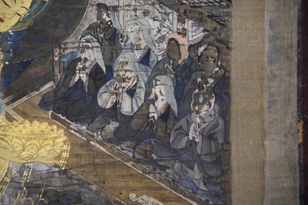 ここに描かれている人たちが、この掛軸を描いてくれと依頼したのではないかと言われています。お寺での仏事で飾り、念仏を唱えながら自分が極楽へ往生することをイメージしていたのではないかと。彼らの表情は柔らかくて安らかで、ちょっと可愛らしい描かれ方をしているなあと思うところでもあります。