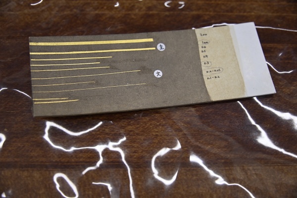 金箔を細く裁断するために「竹刀(ちくとう)」という道具を使います。截金は太い主線と細かい文様の線では、それぞれ太さを変える必要があります。この作品では細いもので0.2~0.3ミリ、太いもので1ミリまで描線の太さに合わせて竹刀で切断します。