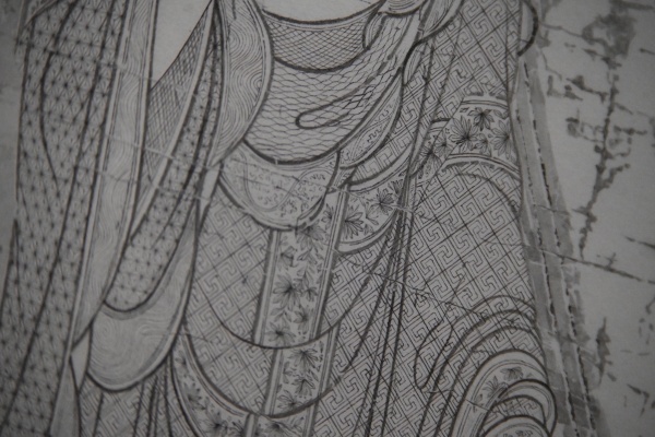花模様や雷紋など、着衣の細かい文様まで写し取った白黒の作品の細部