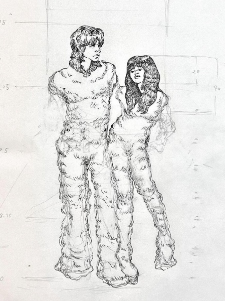最初のプランのエスキース(下絵)では男女が居て、獣が居て首輪でつながっている感じでした。身体を隠すようなわからなさを全面に出していましたが、構想が進むごとにビジュアルを変え、首輪をなくし、足元も最初はつながっていませんでしたが、全体が繋がっている方がいいなとなり形は変化していきました。