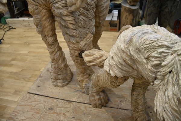 そうです。使ったのは大きいもので直径1mほど、長さは2m10cmくらいだったと思います。およそ5本の木から使うパーツごとに切り出しました。男女、獣もすべて交換できるパーツ間ごとに、腕は腕、頭は頭の木から、といった感じで使用する丸太を統一して作り上げています。