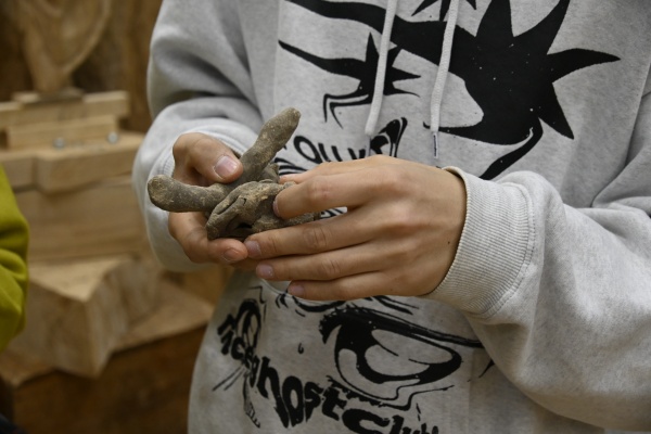 固まらない油粘土で形を探りながらマケット(模型)を作ります。完成サイズを大体想定して縮小率も考えています。この段階はなるべく自分がイメージできる範囲内の手のひらサイズのものを作ります。その後は、乾くとある程度固くなる水粘土で形が変えられないものをスケールを大きくして作ります。