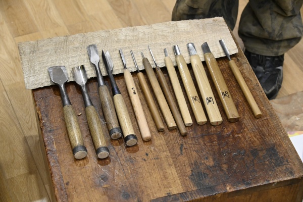 大学1年生の時に木彫実習があり、研ぎや道具の手入れを習いましたが、自分のモノになるのはまだまだです。研ぎのタイミングは彫られたノミの跡に現れる木の様子を見て決めています。切れ味が良いとノミ跡もささくれなくきれいに出ます。今は30本くらいのノミや彫刻刀を使っていて、家にあるものを合わせると100本弱持っています。手入れをきちんとすれば一生ものだと思っています。