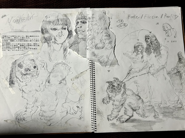 最初のプランでは男女の身体が隠され獣は首輪で繋がっていた(スケッチブック右ページ)