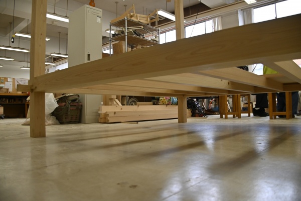 その一番奥に、彼女の修了制作である大きな木の構造体が立ち上がっていました。天井近くまで伸びる柱、組み合わされた桁(けた)*。まだ仕上げの途中であるはずなのに、すでに「庵(いおり)」としての気配をまとっていました。近寄ると、木材の節や色味の違い、そのひとつひとつの木材が呼吸しているようで、白いすべらかな木肌に思わず手を伸ばしたくなる存在感があります。