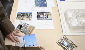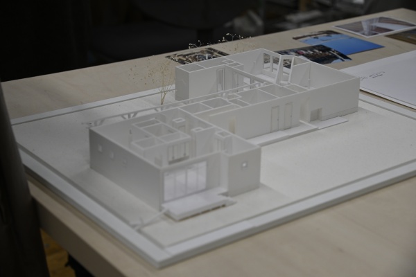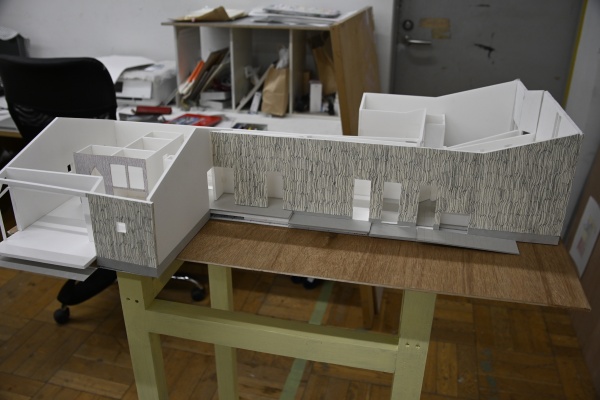 ドローイングの貼られた壁の前の建物模型に目が留まります