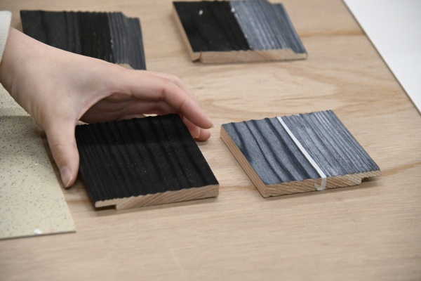 こちらはその焼杉のマテリアルのスタディ(素材の検討)です。焼いたままではマットな黒ですが、その上にオイル塗装をして、さらに強く表面を布でこすってみると、凸になった木目だけが浮き上がり、奥行きや立体感が出るようになりました。このように異なる仕上げ面をどこかで採用していこうと思っています。