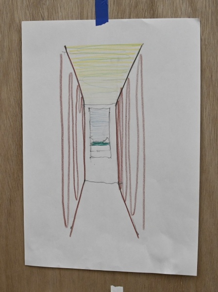 そして、こちらのドローイングも・・・住宅側のトイレ前の壁のポケットに置かれた一輪挿しの花と、奥の窓越しに広がるお庭の風景とが、ちょうど同じ高さで並び、同じ額縁の中に切り取られたように重なって見えています。