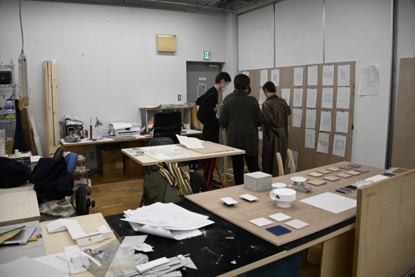 東京藝術大学(以下、藝大)の建築科は1学年たったの15人だそうです。インタビューさせていただいたのはその建築科に所属する学部4年生の岡崎万実子さん。案内された総合工芸棟4階の製図室には、ゆるく仕切られたスペースで各自が研究や制作をする建築科独特の空間が広がります。お話を伺ったのは、まさに追い込み中の12月。卒業制作はなんと、施主さんがいる本物の建築物でした。