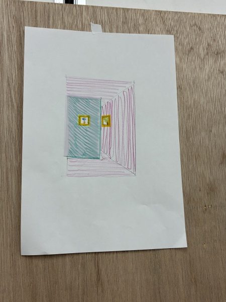 左はドアと室外機の配置を考えたドローイング、右は内側にできた窪みの断面図