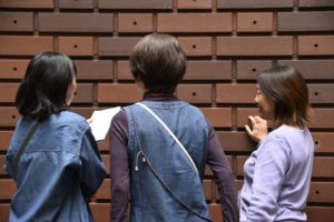 東京都美術館の打ち込みタイルや野外彫刻など様々な「みどころポイント」をどのように説明するかグループごとに相談して決めていきます。