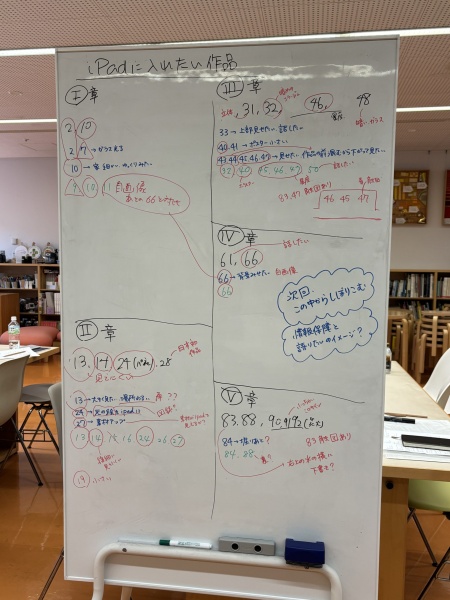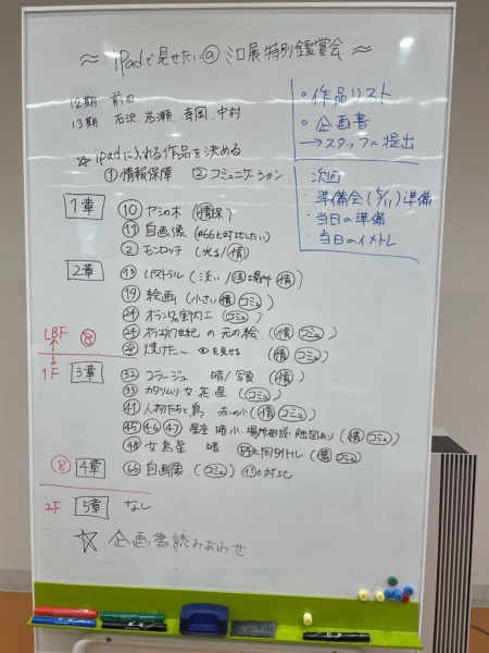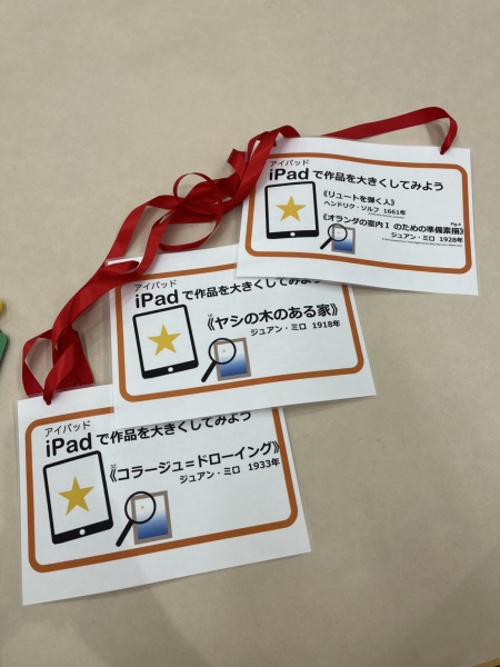 当⽇を迎えるまで、ラボメンバーで準備を重ねました。まずは、どの作品がiPadを活⽤するのに適しているのか、メンバーで展⽰室を回りながら話し合いました。今回のミロ作品は⼤きなものが多く、作品のサイズが⼩さいことが理由で⾒づらいことはあまりないように、はじめは感じていました。しかし、展⽰室を回りながら確認するうちに「この作品は、近寄って⾒るとすごく細かく草⽊が描かれているから、ぜひこれを拡⼤してよく⾒てもらいたいね。」という意見や、「ミロが作品を描く元となったポストカードや素描と、作品を⼿元で⾒⽐べられるとより⾒やすいね。」というような意⾒が出ました。さらに「このエリアは他と⽐べて展⽰スペースの照明を落としていて、⾞椅⼦からだと作品が光ってしまって⾒えづらいかも。」など、さまざまな方に合わせた視点も重視しながら、どのようなコミュニケーションが⽣まれるか想像して、iPadで扱う作品選びをしていきました。