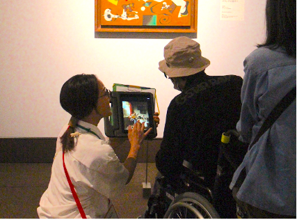 東京都美術館の「ミロ展」で、2025年5⽉26⽇に障害のある⽅のための特別鑑賞会が開催されました。その中でとびラボの活動である、iPad を活⽤した来館者とのコミュニケーションを実施しました。 iPad を使⽤することで、⾞いすの⽅などで壁や台の上の作品が⾒づらい⽅や、ロービジョンの方、細かいところが見えづらい方が、作品を⼿元で拡大して⾒られるなど、アート・コミュニケータ(とびラー)とコミュニケーションしながら作品鑑賞を行う取り組みです。