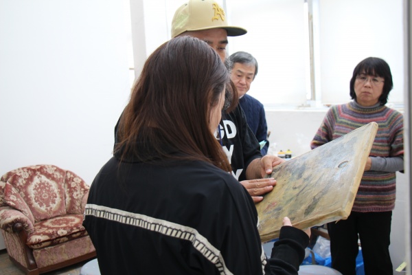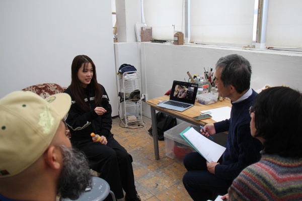 取手駅からバスに乗って10分ほど。そこは雑木林に囲まれた、なだらかな丘陵が続く東京藝術大学(以下、藝大)取手校地の広大なキャンパスでした。絵画専攻(油画)修士2年の大松美加子さんが、構内にあるバスの停留所で私たちを迎えて、制作室に案内していただきました。今回のインタビューは3名のとびラー(アート・コミュニケータ)で行いました。その中には全盲のとびラーもいます。事前にお伝えしていたので、大松さんは用意してくれていて、作品の一つを特別に触らせてくださいました。私たちはそれを手に取り、触感を確かめながらインタビューが始まりました。