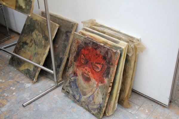 画面に色を載せる方法には、皿で絵の具を混ぜる、画面上で絵の具を混ぜる、絵の具を何層も塗り重ねる、水やお湯をつけた刷毛で上層の絵の具を剥がして下地の色を見せる、など多様なやり方があります。絵を描く道具も、柔らかい筆、硬い筆、刷毛、たわしなど様々なものを使います。例えば、私は油絵用の硬い豚毛筆を使って画面から絵の具を剥がしたりもします。