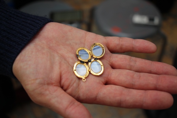 まず、ジュエリーの工法を使った作品の途中経過をお見せします。これは1枚の写真から小さな円をたくさんくり抜いて、ロケットペンダントにはめ込んだものです。ティグ溶接というジュエリーを台座に取り付ける技法を使って、繋げてみました。これらをさらに長く繋げていって形を作ろうと思っています。元の写真は記憶が薄れてきていますが、iPhoneのストレージに残っていた旅行中のものです。