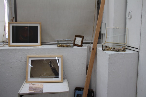 学部生の時の卒業・修了作品展(以下、卒展)に出した作品も制作室に持ってきています。これらは一部が割れたガラスやコップ、サイズアウトした私の子供の靴で、豚革でくるんでいます。どれも形は保っていますが、私からすると既に失われたものです。もう役割を失って、ただの形になった時点での状態を残しておくのにちょうどよいという点で、豚革という素材でくるむことは私にとって、しっくりきました。
