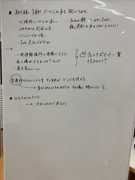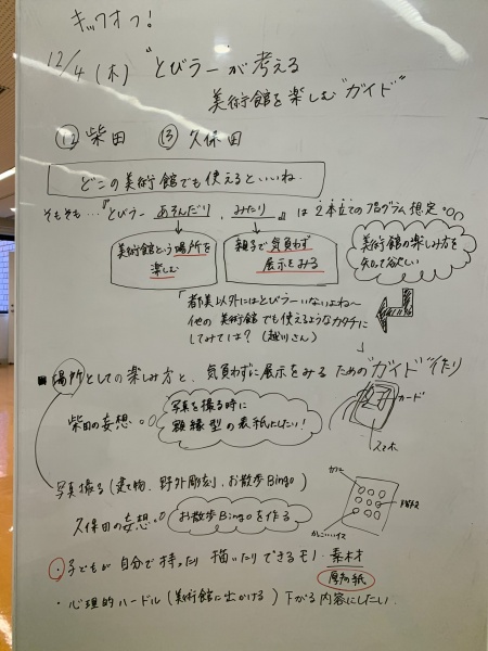 さらに話し合いを進める中で、子どもにとって親でも教師でもない「とびラー」という第三者の存在が、親子で美術館に来る際のハードルを下げるのではないか、という視点が浮かび上がりました。