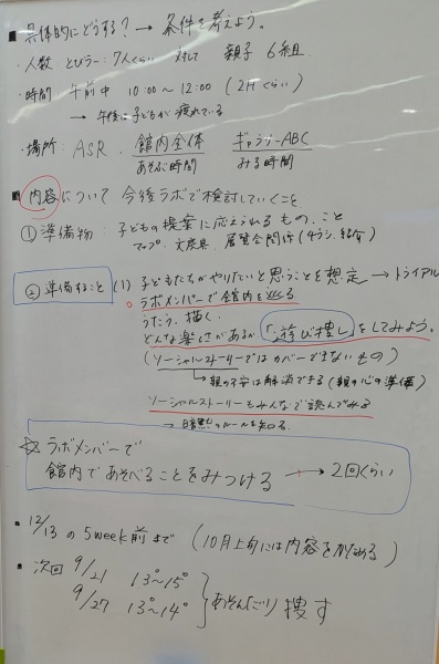 検討を進める中で、とびらプロジェクトと連動するプロジェクト「Museum Start あいうえの」のファミリープログラムや、学校プログラムと、私たちが検討しているアイデアの違いは何か、という問いも持ち上がりました。