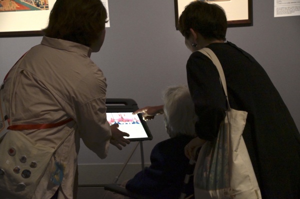 ・触図を用いての鑑賞サポートでは、アート・コミュニケータが来館者と一緒に作品を鑑賞します。アート・コミュニケータは作品に描かれているものを説明したり、作品から受ける印象をお話しします。同時に、来館者の指先を触図にふれさせながら、構図や質感をイメージしてもらいます。