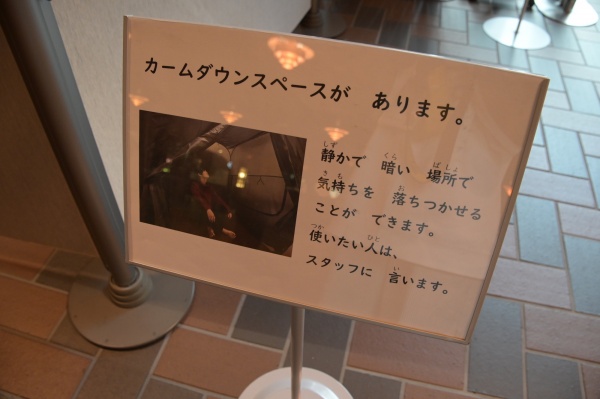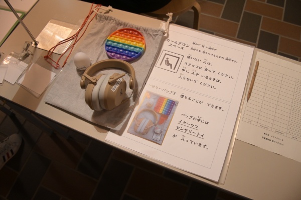 ・また今回は、慣れない移動や人混み、周囲の視線、音、光等の混在により不安やストレスを感じた際に気持ちを落ち着かせたい方のために、「カームダウンスペース」や「センサリーキバッグ」(イヤーマフやセンサリートイなどが入ったバッグ)を導入しました。また、お声掛けが苦手な方にスタッフやアート・コミュニケータが気がつけるようにするための目印(白紙の名札)も用意しました。