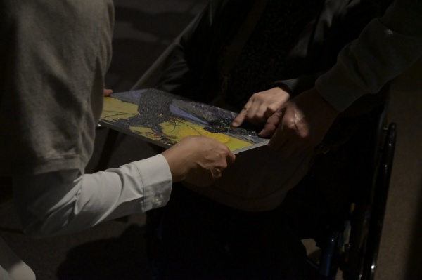 ・今回の特別鑑賞会でも、ミロ展に引き続き、とびラーが「とびラボ」で発案したアイデアが行われました。案内状のデザインや、手元のiPadで拡大画像を明るく見ることができる工夫、また、東京都美術館が制作した触図(しょくず・作品の構図やモチーフを凹凸のある線や点で立体的に表わした図版)を用いた鑑賞サポートも行われました。事前の準備段階から複数のとびラーが関わり、来館者が展覧会に出会うための入口をつくってきました。
