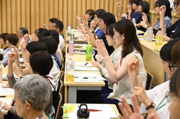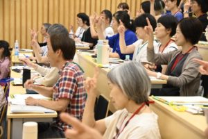 今回の基礎講座も講義の合間にペアで考えたことや疑問点について話し合う時間が多くあります。早速、「この指とまれ式」について活発に話し合いました。