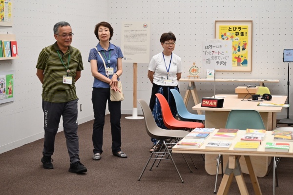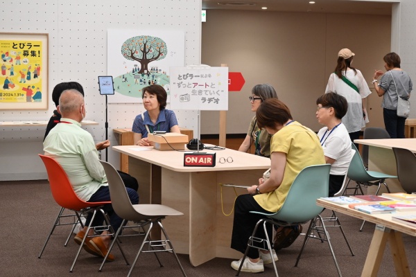 東京都美術館の「アート・コミュニケーション事業を体験する2024(以下、AC展2024)※」開催期間中の週末に、展示室の一角を使って来館者のインタビューを公開収録で行い、「美術館はどんなところか」「どんな思いで美術館に行っているのか」といった、来館者の声を集めました。パーソナリティに扮したとびラーがインタビューをし、楽しく会話が盛り上がるようなトークを展開し、来館者との語らいを重ねる中で新たな発見も感じられました。