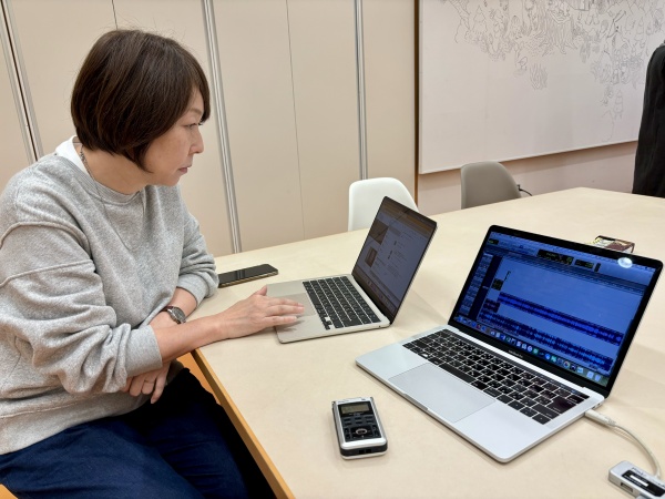 収録が終わった後は、録音状態を確認しながら、届けたいインタビュー素材を編集しました。番組の形に編集していくにあたり、番組の進行役(ナビゲーター)は、録音時のインタビュアー以外の人を担当としました。ナビゲーターは、自ら番組の進行台本を書き、声を録音しました。とびラーにとっては初挑戦の作業でした。